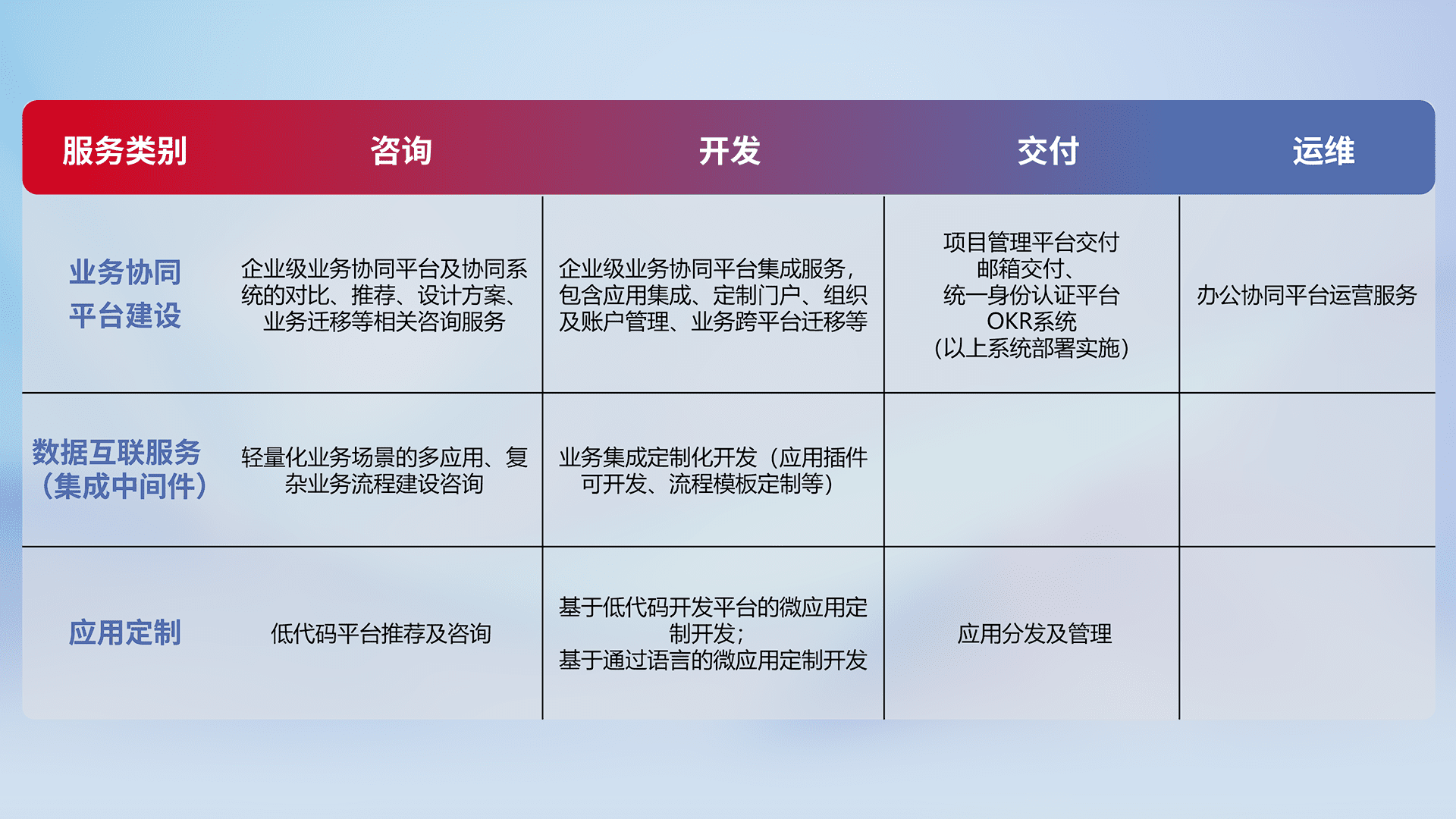 针对钉钉、、、、企微、、、IDaas等平台级产品提供产品的规划、、方案、、、交付、、定制化开发等服务,,实现如统一协同办公、、、、智能客户服务、、混合会议管理、、智能数据查询、、等业务场景,,实现数字化转型。。。