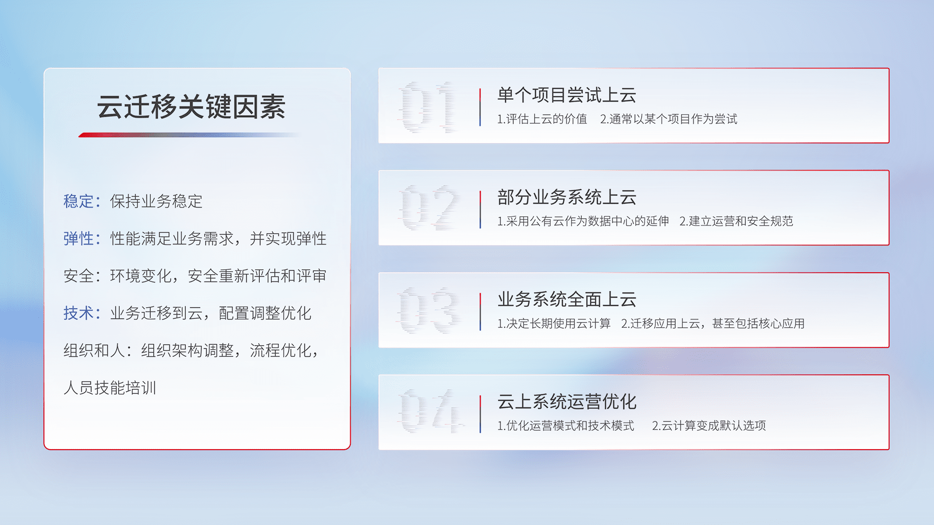 结合实际业务,,从规划设计、、、云平台选型、、、、云原生改造、、、数据迁移、、、、集成交付,,,,迁移全过程为客户识别最佳上云路径,,,,做好风险识别管理,,,,设计网络架构、、、身份权限、、安全审计合规、、、、操作审计、、、、日志审计、、、、监控告警策略、、、、多站点容灾设计等,,,对云上基础设施进行整体规划,,提升IT治理水平,,,,以满足弹性、、、高可用、、高性能的需求。。