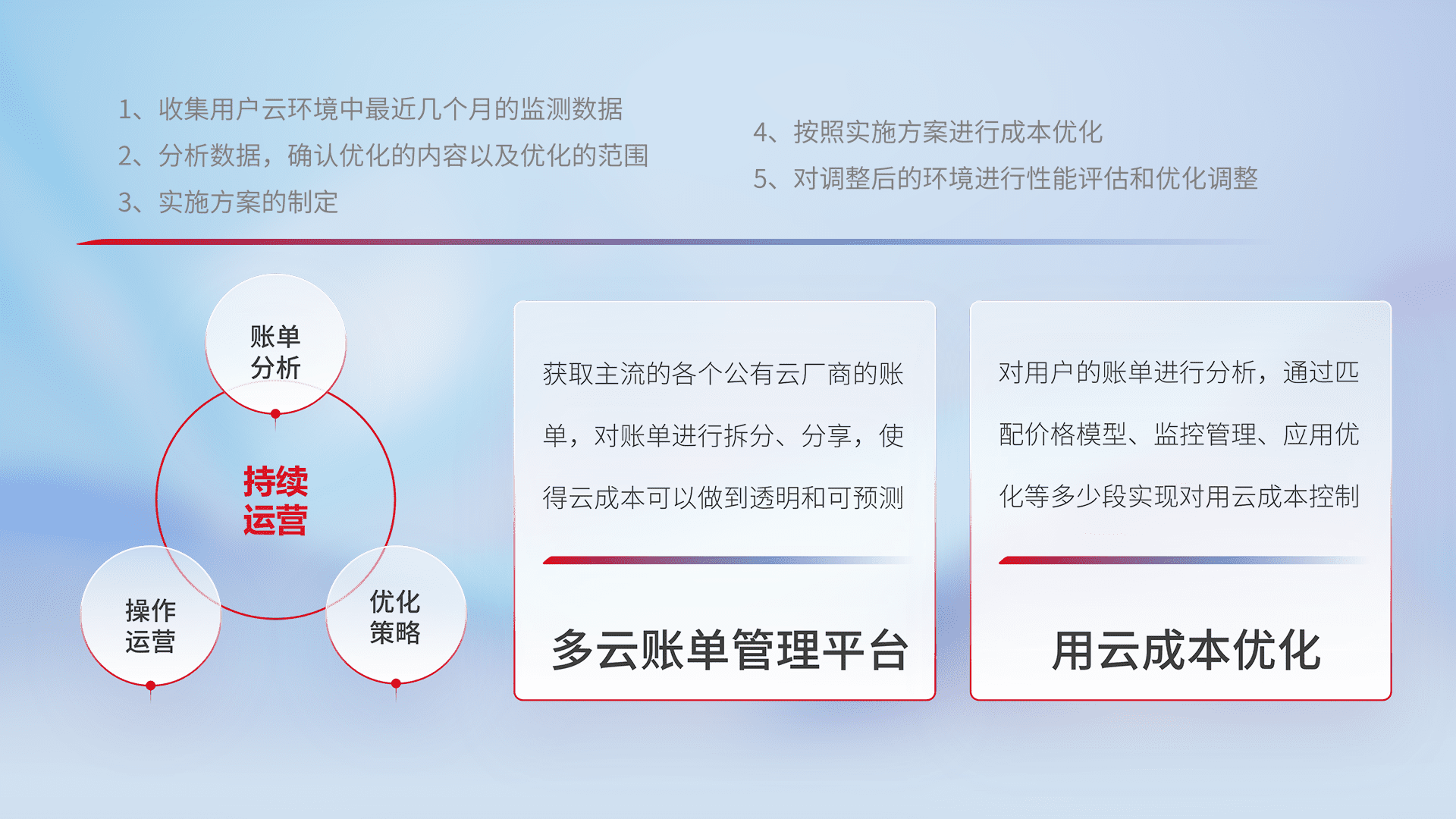 通过多云纳管,,以统一的资源数据模型把客户的云资源进行抽象和封装,,,,进而实现对多云资源的统一操作,,,,保障云资源管理的可靠性、、稳定性与可用性。。。。量身定制化运维内容,,,配置、、、开发运维、、、补丁管理、、、、备份、、、、监控、、认证和访问管理、、、、审计和日常巡检等,,保障在用云过程中的可靠度,,,,稳定度以及高可用率。。