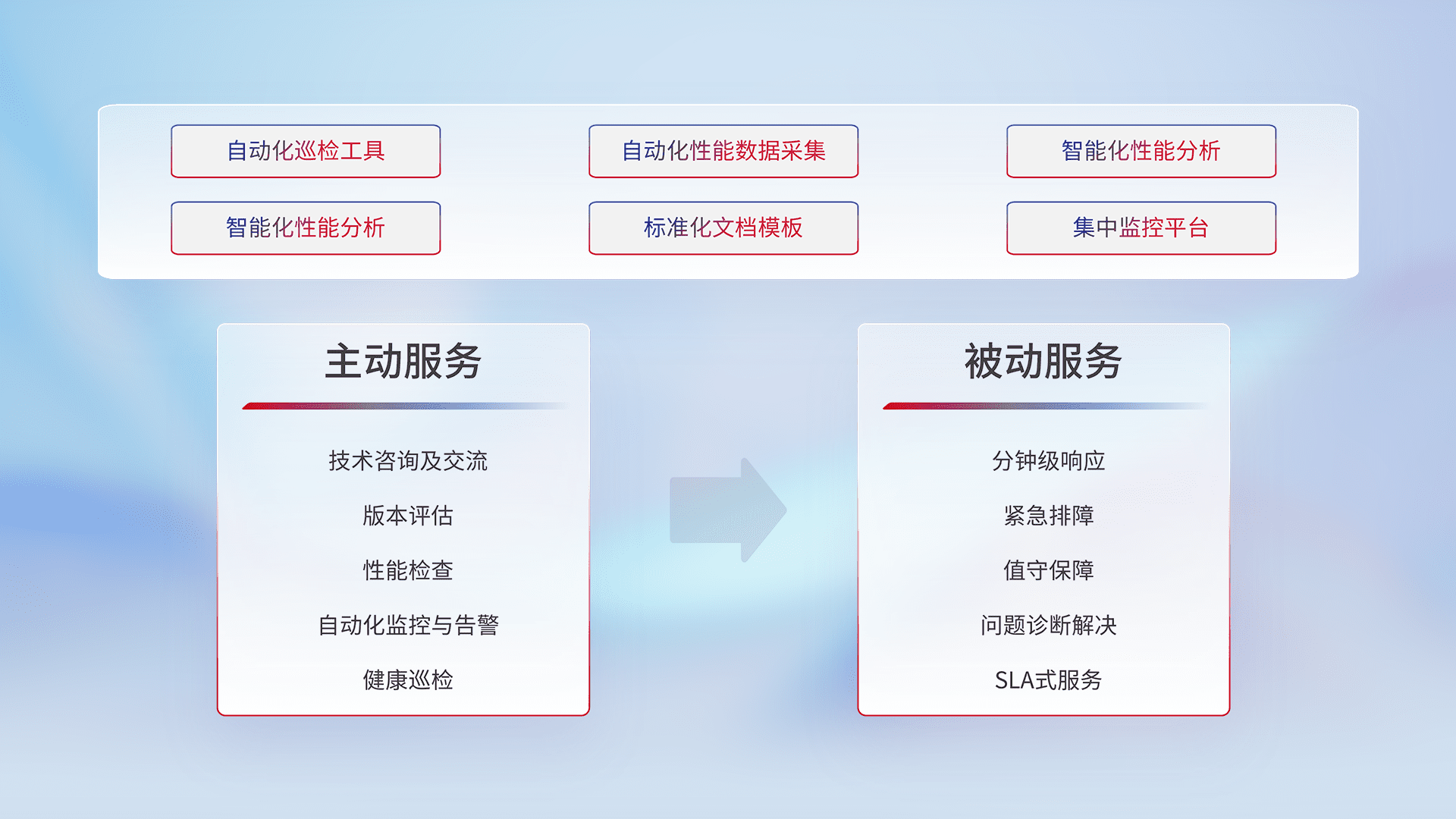 智能化工具和标准化文档,,,保障服务质量,,,,提供主动服务(包含技术咨询、、、版本评估、、、、性能检查、、、自动化监控与告警、、、健康巡检)和被动服务包含(分钟级响应、、、、紧急排障、、值守保障、、问题诊断解决、、SLA服务)。。。。